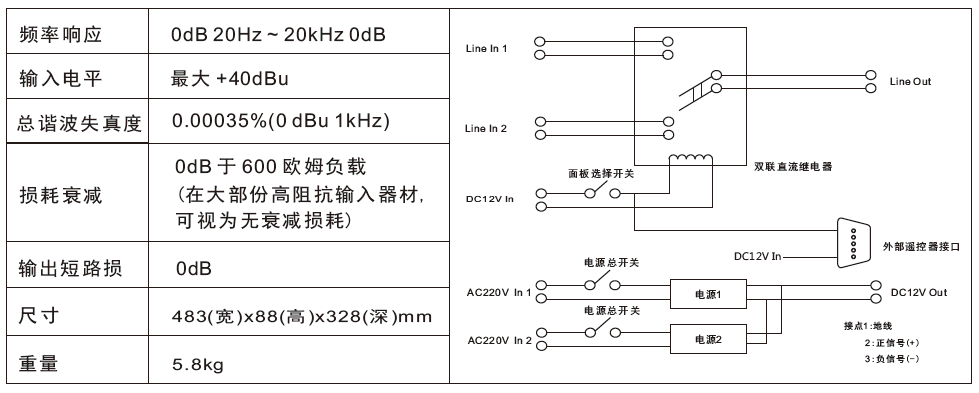 整系列的主备系统切换系统,是设计于为能灵活切换主备输入信号的音频系统安排工作。采用全标准卡农接线座设计,用户可轻易地通过前面板开关来切换输入信号。专业广播质量的主备系统切换器,可提供要求高的音频指标,选用一级质量的继电器,能提供处理高达+24dBu的音频电平讯号。